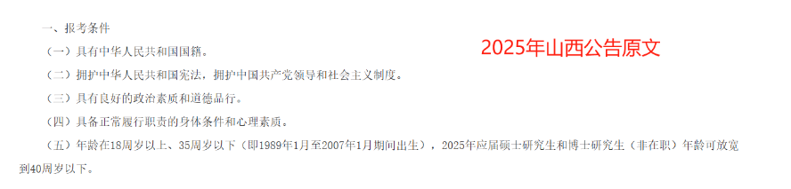 按照往年惯例,新一年的省考可报名年限区间都会顺延至一年,月份截止时间不变。在2025年山西省考中,1989年1月至2007年1月期间出生的考生均可报考。同时,与往年一样,硕士和博士由于其毕业时间较晚。今年依旧对高学历考生放宽条件。应届硕士、博士、研究生年龄放宽到40周岁以下(1984年1月以后出生)