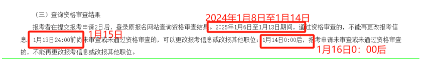 注意:2025年1月6日至1月13日期间,通过资格审查的,不能再更改报考信息;1月13日24:00前尚未审查或未通过资格审查的,可以更改报考信息或改报其他职位;1月14日0:00后,报考申请未审查或未通过资格审查的,不能再更改报考信息或改报其他职位。